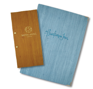 The Sherwood menu cover has a luxurious synthetic wood grain appearance, suitable for all types of restaurants and food outlets. This menu cover has 14 wood colours, from the more traditional to the very bright vibrant oranges, yellows and blues. The Sherwood menu cover can be personalised by foil blocking, heat embossing or metal plate. With seven different sizes to choose from, with clear pockets available for your menu inserts, this restaurant menu cover can be used as a main menu, dessert menu and wine menu.